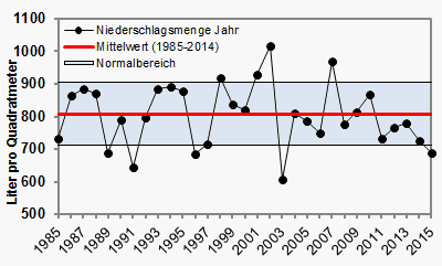2015 präsentierte sich mit einem Deutschlandmittel von knapp 700 Liter Regen pro Quadratmeter vergleichsweise trocken. Besonders die Mitte und der Süden litten unter Dürre, während die Niederschlagsbilanz sonst eher ausgeglichen war.