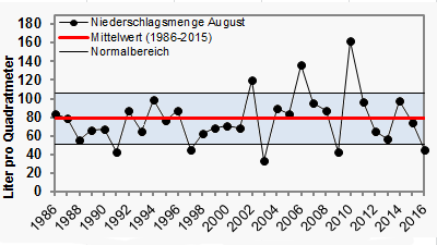 Mit 45 Liter pro Quadratmeter kam deutlich weniger Niederschlag als im Mittel von 1986 bis 2015 zusammen. Reichlich Regen gab es nur im äußersten Süden des Landes. Auf Oberstdorf prasselten alleine am 4. und 5. August 90 Liter pro Quadratmeter. In der Mitte des Landes war es am trockensten, teils wurden kaum 10 Liter Regen registriert. In den westlichen Bundesländern setzte sich die Trockenheit aus dem Juli fort. Im Norden führen die Orte in Nordseenähe die Liste der nassesten Orte an: In Helgoland waren es 70, in Emden sogar rund 100 Liter.