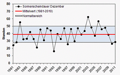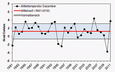 Der Dezember 2011 war durchschnittlich zwei bis zweieinhalb Grad wärmer als im langjährigen Mittel der Jahre von 1981 bis 2010. Besonders auffällig ist der Kontrast zum Vorjahr, als der Dezember extrem kalt ausgefallen war.