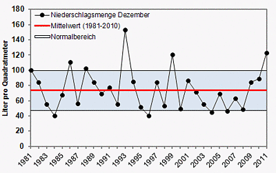Nur selten regnete es in einem Dezember mehr als im Jahr 2011. Ähnlich nass war nur der Dezember 1999, noch nasser mit über 150 Liter Regen pro Quadratmeter der Dezember 1993.