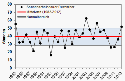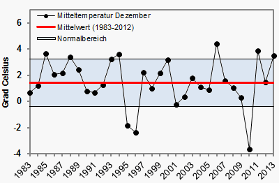 Mit durchschnittlich plus 3,5 Grad ist der Dezember 2013 einer der fünf mildesten Weihnachtsmonate der letzten 30 Jahre gewesen. Außerdem war er sehr trocken und bescherte vor allem dem Süden viel Sonne.