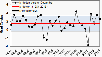Mit einer Mitteltemperatur von 2,6 Grad setzte sich auch im Dezember die Serie überdurchschnittlich warmer Monate fort. Wärmster Tag war der 23., wo im Süden vielfach Temperaturen nahe 15 Grad gemessen wurden. In der Nähe von Weilheim in Oberbayern wurden sogar 17 Grad erreicht. Kälteste Region war Oberschwaben, wo am Morgen des 29. in Riedlingen über Schnee fast minus 25 Grad gemessen wurden. Aber auch im Allgäu war es an diesem Morgen fast minus 20 Grad kalt.