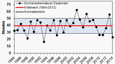 Die Sonne ließ sich im ersten Wintermonat landesweit selten blicken. Vor allem in Teilen Frankens sowie im Oberpfälzer Wald war es außergewöhnlich trüb: In Nürnberg wurden keine 20 und in Weiden sogar deutlich unter 10 Sonnenstunden registriert. Dagegen schien die Sonne in Südbayern überdurchschnittlich häufig. So kamen in München mehr als 50 Sonnenstunden zusammen. Im Landesdurchschnitt lag die Sonnenscheindauer jedoch nur bei etwa 60 Prozent des Klimamittels. Der Monat war damit unterm Strich ungewöhnlich trüb.