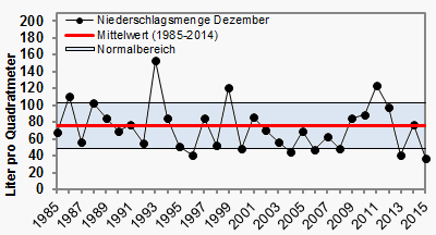 Auch bei den Niederschlägen war der Dezember 2015 auf Rekordkurs. In den letzten 30 Jahren war kein Monat trockener, im Deutschlandmittel fielen nur 36,5 Liter auf den Quadratmeter. Am wenigsten geregnet hat es an den Nordrändern der Mittelgebirge, in Harznähe fielen örtlich kaum 5 Liter Niederschlag. Am nassesten war es mit 150 Liter Regen in Teilen Schleswig-Holsteins. Aufgrund der milden Luft und der geringen Niederschläge gab es selbst in den Bergen bis auf spärliche Reste in den höchsten Lagen praktisch keinen Schnee mehr.