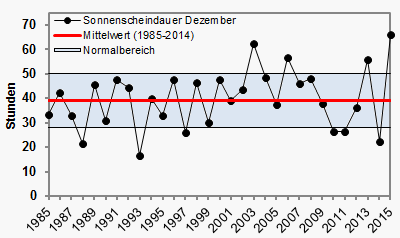 Die Sonne machte dagegen reichlich Überstunden. Mit rund 65 Stunden im Mittel war es der zweitsonnigste Dezembermonat seit 1951. Am meisten Sonnenstunden gab es im Süden, dort wurden zum Teil viermal mehr Sonnenstunden gemessen als im langjährigen Mittel. Die sonst in den Wintermonaten typischen Nebel- und Hochnebelwetterlagen für Südbayern und den Bodenseeraum blieben fast durchweg aus. Insgesamt deutlich trüber war es dagegen nur ganz im Norden, örtlich wurde dort sogar nicht einmal das Klimamittel erreicht.