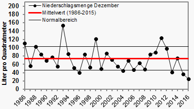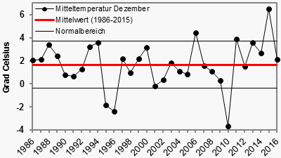 Der letzte Monat des Jahres 2016 ist auf den Bergen und im Norden zum Teil deutlich milder als im langjährigen Mittel gewesen. Entlang des Oberrheins war es teils etwas kälter als sonst üblich. Im Deutschlandmittel lag die Temperatur bei 2,1 Grad. Somit war es 0,4 Grad wärmer als im Durchschnitt der vergangenen 30 Jahre. Die höchsten Werte konnten am 8.12. in Wernigerode im Harz mit 15,5 Grad gemessen werden. Kurios: Nur eine Nacht zuvor zeigte das Thermometer in Oberfranken mit minus 12,1 Grad die tiefsten Werte des Monats an.