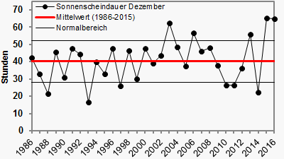 Der Dezember war nach 2015 der zweitsonnigste der letzten 30 Jahre. Im Landesmittel schien die Sonne stolze 65 Stunden lang. Dies sind rund 25 Stunden mehr als sonst üblich. Die Unterschiede zwischen Nord und Süd, sowie Tal und Berg waren aber groß: Während sich die Sonne in Schleswig-Holstein teils kaum 25 Stunden lang zeigte, gab es im Süden mancherorts knapp 150 Sonnenstunden. Durch die anhaltenden Hochdrucklagen schien die Sonne auf den Bergen deutliche häufiger, als in den zumindest zeitweise trüben Tälern.