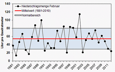In den Wintermonaten fällt generell nicht so viel Niederschlag wie im Sommer. Aber der Februar 2012 gehört mit nur etwa 24 Liter pro Quadratmeter auch im Wintervergleich zu den "trockenen Ausreißern".