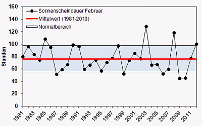 Rund 100 Stunden lang schien die Sonne im Februar 2012 im Mittel. Der Monat präsentierte sich damit auch ungewöhnlich sonnenscheinreich und lag mit dieser Bilanz leicht oberhalb des Normalbereichs.