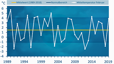 Trotz Kaltstart und vielen frostigen Nächten war der Februar 2019 ein außergewöhnlich milder Monat. So war er mit knapp 4 Grad fast zweieinhalb Grad wärmer als im langjährigen Klimamittel. Kurz nach der Monatsmitte, vor allem aber in den letzten Monatstagen wurde regional bereits vielfach die 20-Grad-Marke überschritten. Wärmster Ort war Saarbrücken-Burbach, wo am 27. Februar 21,7 Grad gemessen wurden. Dem stehen eisige minus 17,9 Grad am kältesten Ort im Oberpfälzer Waldmünchen gegenüber. Diese wurden am Morgen des 5. Februar registriert.
