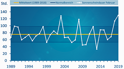 Nachdem das Schneetief abgezogen war übernahmen im ganzen Land stabile Hochdruckgebiete die Wetterregie. Sie ließen die Zahl der Sonnenstunden auf ein weit über dem Durchschnitt liegendes Niveau steigen. Diese summierten sich auf rund 130 Stunden Sonnenschein, also rund drei Viertel mehr als im Durchschnitt der letzten 30 Jahre. Damit wurde der Monat zum sonnenscheinreichsten Februar seit Messbeginn. Am häufigsten schien die Sonne vom Oberrhein bis zum Bodensee - am seltensten zeigte sie sich im Osten von Vorpommern.