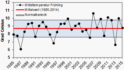 Die Mitteltemperatur traf im Frühling mit 8,8 Grad fast genau das Mittel der vergangenen 30 Jahre. Warme und kühle Abschnitte wechselten einander ab. Am wärmsten war es am 12. Mai, als an Rhein, Main und Neckar örtlich die 30-Grad-Marke geknackt wurde. Mit minus 10,6 Grad wurde die tiefste Temperatur am 7. März in Oberstdorf gemessen. Die Eisheiligen brachten dieses Mal bis Ende Mai besonders im Norden wiederholt Bodenfröste.
