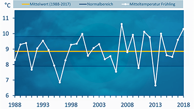 Mit einer Durchschnittstemperatur von 10,3 Grad war der Frühling 2018 sehr warm. Dabei startete er eisig. Die tiefste Temperatur wurde am 2. März im vorpommerschen Barth mit minus 19,2 Grad gemessen. Auf einen März, der sogar kälter als der Januar war, folgten ein extrem warmer April und Mai. Beide waren die wärmsten seit über 130 Jahren. Bis Anfang April gab es zwar noch winterliche Phasen, dann allerdings kam sprunghaft der Frühsommer nach Deutschland. Dieser gipfelte Ende Mai bei bis zu 34 Grad in der ersten Hitzewelle des Jahres.