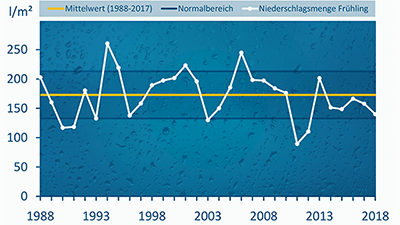 Mit lediglich rund 140 Liter Niederschlag pro Quadratmeter war der Frühling deutschlandweit sehr trocken. Ein großer Teil davon kam in einigen Orten allerdings an nur wenigen Tagen vom Himmel. Dafür waren im frühsommerlichen April und Mai heftige Unwetter verantwortlich. Starkregen und Hagelschlag richteten dabei große Schäden an. Zu Beginn des Frühjahrs schneite es dagegen im März sowie zu Ostern Anfang April vor allem im Nordosten Deutschlands noch ungewöhnlich viel.