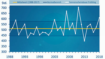 Beim Sonnenschein kam im Frühling so gut wie keine Region zu kurz. In einigen Gebieten im Osten des Landes gab es sogar 50 Prozent mehr Sonne als üblich. In Brandenburg und Berlin schien sie verbreitet mehr als 700 Stunden, am wenigsten war es an einigen Orten im Südwesten und Westen mit weniger als 500 Stunden. Insgesamt zeigte sich der Frühling jedoch fast überall deutlich sonniger als im langjährigen Durchschnitt. Deutschlandweit kamen so mit rund 610 Sonnenstunden beachtliche 100 mehr als im Mittel zusammen.