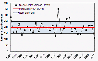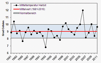 Außerdem war der Herbst 2011 mit einem bundesweiten Durchschnitt von 9,7 Grad etwa 0,7 Grad wärmer im Vergleich zu den letzten 30 Jahren. Die beiden heißesten Tage waren der 3. und der 11. September, als in Trier und im thüringischen Gera jeweils 31,8 Grad gemessen wurden. Die kälteste Nacht mit Tiefstwerten von knapp minus 9 Grad war am 25. November.