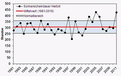 Mit einer durchschnittlichen Sonnenscheindauer von 429 Stunden lag der Herbst 2011 in Deutschland etwa 38 Prozent über dem Klimawert von 311 Stunden. Das ist Platz zwei wenn man die letzten dreißig Jahre von 1981 bis 2010 heranzieht. Noch mehr Sonnenstunden gab es nur im Jahr 2005. Am längsten schien die Sonne auf der Zugspitze, wo rekordverdächtige 642 Sonnenstunden zusammen kamen. Dagegen schien die Sonne in der Region Kiel nur knapp 310 Stunden lang. Dort brachten östliche Winde immer wieder Seenebel mit.