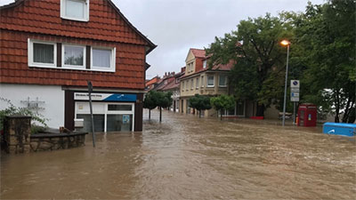 Wasser fließt durch die Straßen von Bad Salzdetfurth: Unwetterartige Regenfälle haben im Juli im Süden Niedersachsens zu schweren Überflutungen mit Deichbrüchen geführt. Bild: Sjoeman
