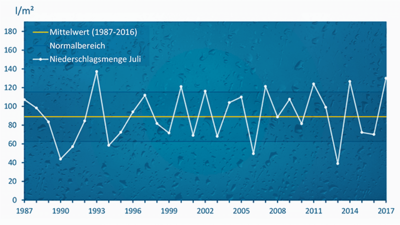 Der unwetterreiche Juli 2017 ist der regenreichste seit 1993 gewesen. Schwere Überflutungen gab es vor allem durch Regentief ALFRED. Bei Sonne und Temperatur gab es regional große Unterschiede.