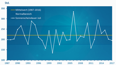 Der viele Regen und der Mangel an stabilem Sommerwetter wirkten sich auch auf die Sonnenscheindauer aus. Insgesamt war der Juli etwas trüber als im langjährigen Mittel. Besonders wenig Sonne gab es rund um den Harz, wo sie teils unter 150 Stunden lang schien. Dagegen konnte man sich vom Bodensee bis nach Passau über fast 250 Sonnenstunden freuen. Trotz dieser Unterschiede gab es praktisch landesweit etwas weniger Sonne als im langjährigen Mittel.