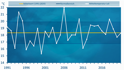 Mit 18,3 Grad war der Juli so warm wie im Mittel der vergangenen 30 Jahre. Viele dürften den Sommermonat jedoch als deutlich kühler empfunden haben. Zum einen war dies den vielen bewölkten Tagen geschuldet. Zum anderen gingen die Temperaturen im Gegensatz zu den vergangenen drei Jahren nur selten über 30 Grad hinauf. Interessanterweise war der diesjährige Juli sogar ein wenig kühler als der Juni. Dabei pendelten sich die Temperaturen meist zwischen 20 und 25 Grad ein. Längere Zeit war dies im Norden des Landes der Fall.
