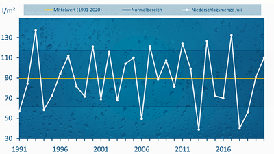 Im Juli fielen bundesweit im Durchschnitt rund 110 Liter Regen pro Quadratmeter und damit rund ein Fünftel mehr als im Mittel der vergangenen 30 Jahre. Über den ganzen Monat verteilt kam am Alpenrand mit Mengen über 300 Liter der meiste Niederschlag zusammen. Das ist anderthalb Mal so viel, wie im Juli üblich. Im Norden und Osten des Landes gab es dagegen auch Regionen mit geringen Regenmengen. So reichte es beispielsweise in der Magdeburger Börde gerade mal für 20 Liter. In der Folge brachen kleinere Wiesen- und Waldbrände aus.