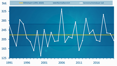 Der viele Regen und das wechselhafte Wetter wirkten sich auf die Sonnenscheindauer aus. Insgesamt war der Juli etwas trüber als im langjährigen Mittel. Besonders wenig zeigte sich die Sonne in den westlichen Landesteilen, wo lediglich rund 170 Sonnenstunden gezählt wurden. Zu den sonnigsten Regionen mit über 230 Stunden gehörten die Insel Rügen und der Südosten Niederbayerns.