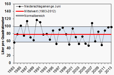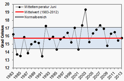 Die großen Temperaturschwankungen innerhalb des Monats haben sich am Ende ziemlich genau ausgeglichen. Mit 15,8 Grad Durchschnittstemperatur lag der Juni mitten im Normalbereich. Aus der Zeitreihe nach oben herausragend ist der Juni vor zehn Jahren, der den Hitzesommer 2003 einleitete.