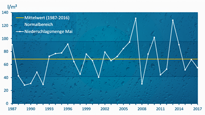 Die vielen Tage mit Sonnenschein bedeuten allerdings auch nur wenig Regen. Durchschnittlich fielen im Mai nur rund 80 Prozent der sonst üblichen Regenmenge. Dabei gibt es allerdings enorme Kontraste: Während es im Osten und auch im Westen Deutschlands eher trocken war, kam an einigen Orten in der Landesmitte teilweise mehr als das Doppelte des langjährigen Durchschnitts vom Himmel. Ursache dieser großen Kontraste waren die heftigen Unwetter mit enormen Regenmengen, die aber nicht jeden trafen.