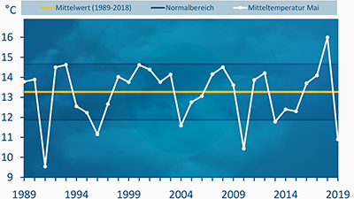 Mit 10,9 Grad war der Mai 2019 landesweit um 2,4 Grad kälter als im Mittel der vergangenen 30 Jahre und sogar mehr als fünf Grad kälter als der rekordwarme Mai 2018. Fast pünktlich gaben auch mal wieder die Eisheiligen ein Stelldichein.