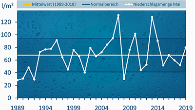 Mit rund 80 Liter Regen pro Quadratmeter war der Mai im Landesmittel fast 20 Prozent feuchter als im Klimamittel. Am meisten Regen fiel mit rund 400 Liter pro Quadratmeter in den Alpen.