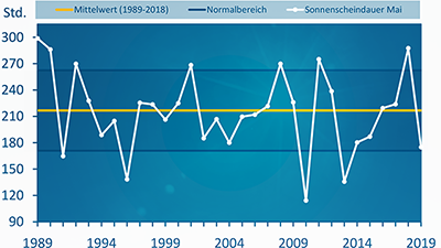 Während sich die häufigen Niederschläge und die kühle Witterung nach dem extremen Dürrejahr 2018 als Segen für die Land- und Forstwirtschaft erwiesen, ließ die Zahl der Sonnenstunden in diesem Mai zu wünschen übrig. Aber auch hier gab es regional sehr große Unterschiede: So standen über 220 Sonnenstunden an den Küsten kaum 120 Stunden in den Alpen gegenüber. Im Landesmittel wurden 175 Stunden mit Sonnenschein registriert und damit spürbar weniger als nach dem Klimamittel.