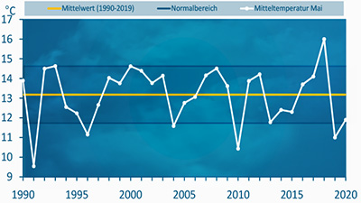 Der Mai 2020 ist der erste unterdurchschnittlich temperierte Monat seit einem Jahr. Letztmals schaffte dies der Mai 2019, der mit 10,9 Grad noch ein Grad frischer war als der diesjährige.