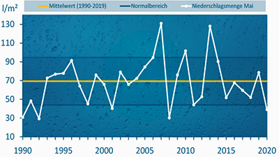 Nach dem sehr trockenen April blieb auch der Mai deutlich hinter den Erwartungen zurück. Im Schnitt reichte es nur für 39 Liter Regen pro Quadratmeter. Dies sind rund dreißig Liter weniger als in einem durchschnittlichen Wonnemonat. Die regionalen Unterschiede waren allerdings groß: Während am Alpenrand nicht selten mehr als 150 Liter zusammenkamen, blieb es in der Nordwesthälfte sehr trocken. So reichte es in Teilen von Nordrhein-Westfalen, wie zum Beispiel in Dormagen, für nur wenig mehr als 5 Liter Regen.