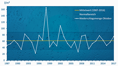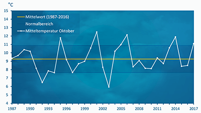 Im Vergleich zum vorangegangenen, kühlen September hat der Oktober einiges wettgemacht. Mit einem Durchschnittswert von 11,1 Grad lag die Temperatur um fast zwei Grad über dem Mittel der vergangenen dreißig Jahre. Dabei war die erste Hälfte gar nicht so warm, in den Alpen fiel sogar schon Schnee. Erst nach Monatsmitte folgte eine sehr warme Episode mit Spitzenwerten bis zu 28 Grad und örtlichen Temperaturrekorden. Herbstlich kühl wurde es mit ersten Nachtfrösten erst Ende Oktober.