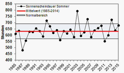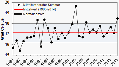 Der Sommer 2015 war vor allem in der Mitte und im Süden sehr warm. Im Juli und August lagen die Höchstwerte dort teils wochenlang um oder über der 30-Grad-Marke. Verbreitet wurden neue Hitzerekorde gemessen. Im bayerischen Kitzingen war es am 5. Juli und auch am 7. August sogar 40,3 Grad heiß, 0,1 Grad mehr als der Allzeit-Hitzerekord aus dem Sommer 2003. Im Norden war es deutlich weniger warm, hier sorgte frische Meeresluft immer wieder für kühlere Phasen. Dort trat im Juni und Juli sogar in mehreren Nächten Bodenfrost auf.