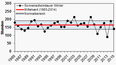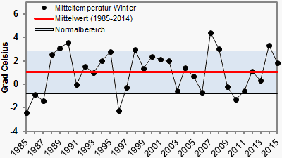 Zwar wies der Winter 2014/15 gegenüber dem langjährigen Klimamittel ein deutliches Temperaturplus auf, doch bewegte sich die Durchschnittstemperatur immerhin noch im (oberen) Normalbereich.