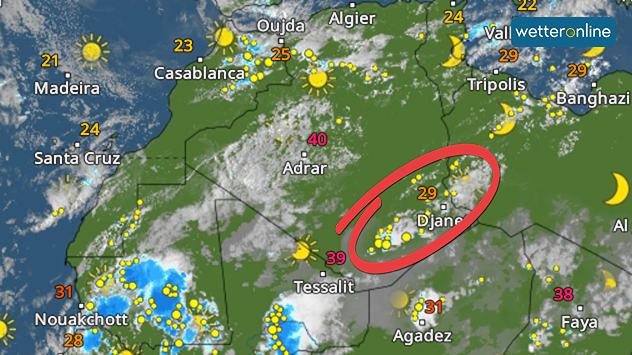 Selten, aber nicht unmöglich: Das WetterRadar von Dienstagabend zeigte mitten über der Sahara-Wüste Gewitter.Ein für die Sahara ungewöhnliches Wetterphänomen konnte am Dienstagabend beobachtet werden: Trotz der großen Trockenheit über dem heißen Wüstengelände hatten sich zahlreiche kleine Gewitter gebildet. Wie ist sowas möglich?