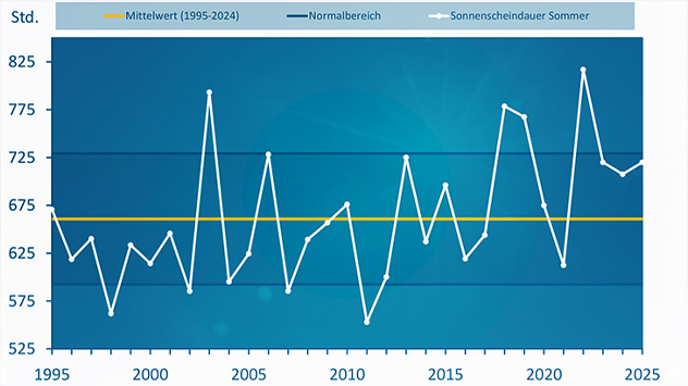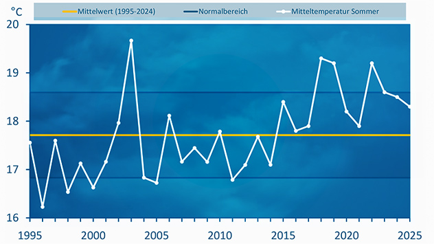 Der Sommer 2025 war etwas kühler als in den vergangenen drei Jahren, reiht sich aber dennoch als siebtwärmster Sommer seit 1881 ein.Nur im Juli richtig viel Regen