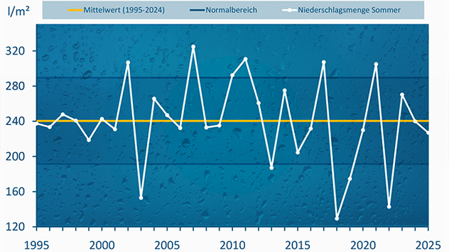 Im Sommer fielen bundesweit rund 227 Liter Regen pro Quadratmeter – etwas weniger als im Mittel. Während Juni und August meist trocken verliefen, sorgte ein regenreicher Juli für Entlastung.