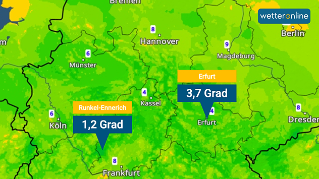 | Erfurt-Weimar (Thüringen) | 3,7 Grad (neuer Stationsrekord) |