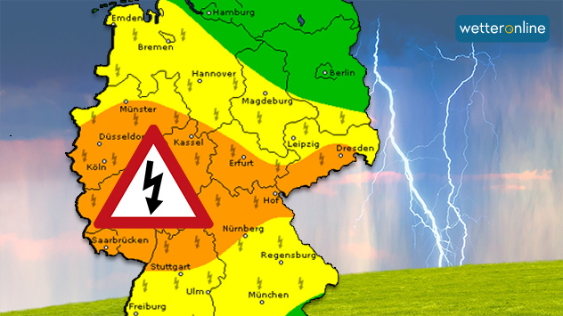 Die Warnkarte zeigt heute für den Westen und die Landesmitte eine höhte Gewittergefahr mit Unwetterpotenzial. - © muratart/Shutterstock.comHeute entwickeln sich in schwülwarmer Luft kräftige Gewitter. Die größte Unwettergefahr besteht dabei in einem Gebiet vom südlichen Nordrhein-Westfalen und Rheinland-Pfalz über Hessen bis ins nördliche Bayern.