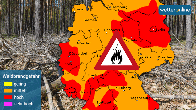 Die Karte zeigt, wie hoch die Waldbrandgefahr am Wochenende ist.Durch das trockene und länger sonnige Wetter der vergangenen Wochen ist die Waldbrandgefahr deutlich angestiegen. Auch die phasenweise hohen Temperaturen und ein kräftiger Wind ließen die Böden zusätzlich austrocknen.