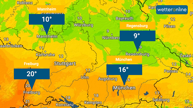 Warme Luft strömte ins Land, wodurch die Temperaturen in den südlichen Städten anstiegen Regengebiete zogen durch den Norden von Baden-Württemberg und Bayern, wodurch es sich in diesen Regionen eher abkühlte