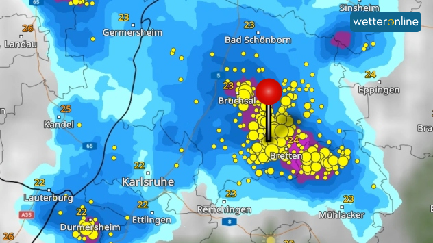 Im Gebiet östlich von Karlsruhe entladen sich am Dienstagabend über mehrere Stunden hinweg Unwetter mit Starkregen, wie im WetterRadar zu sehen ist.Auf einer Bahnstrecke Richtung Bruchsal wurde der Bahnverkehr eingestellt, auch der Bahnhofsbereich der Stadt wurden wegen Überschwemmungen gesperrt.