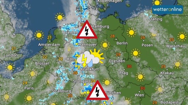 Im Tagesverlauf zieht die Front weiter Richtung Landesmitte und Süddeutschland. Besonders am Nachmittag können sich in schwülwarmer Luft auch stärkere Gewitter entwickeln. Punktuell sind Unwetter durch Starkregen und Sturmböen nicht ausgeschlossen.